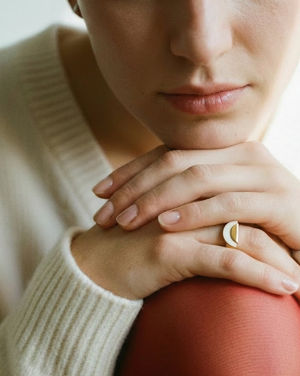 Une bague où la céramique façonnée rencontre la lumière du métal. Sa forme épurée exprime un équilibre entre matière et présence. Pensée comme un objet du quotidien, elle accompagne le geste avec justesse.